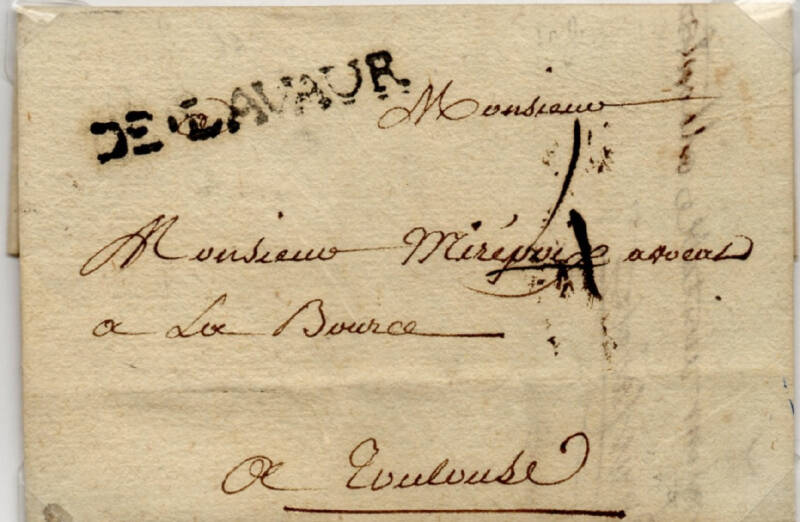 Lettre en port dû de Lavaur pour Toulouse (Haute-Garonne) avec griffe « De Lavaur » du25 mars 1790 avec taxe manuscrite 4 décimes